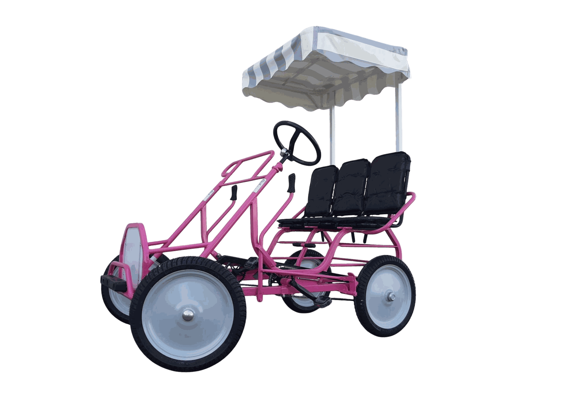 Deze unieke go-cart is gemaakt voor gezelschap: met plek voor twee tot wel negen personen wordt elk ritje een mini-feestje. Voorin of achterin, groot of klein – iedereen rijdt mee. Kies voor een gezellige twee - of driezitter, breidt uit met een achterbank, kinderzitjes of extra plaatsen – samen trappen, lachen en beleven. Altijd voorzien van een stevig dakje, rijd je comfortabel en beschut, in zon of lichte regen.